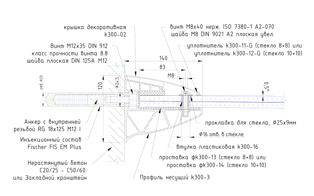 Крепление стеклодержателя (рутеля) к стене под резьбу М14 (AISI304) k660
