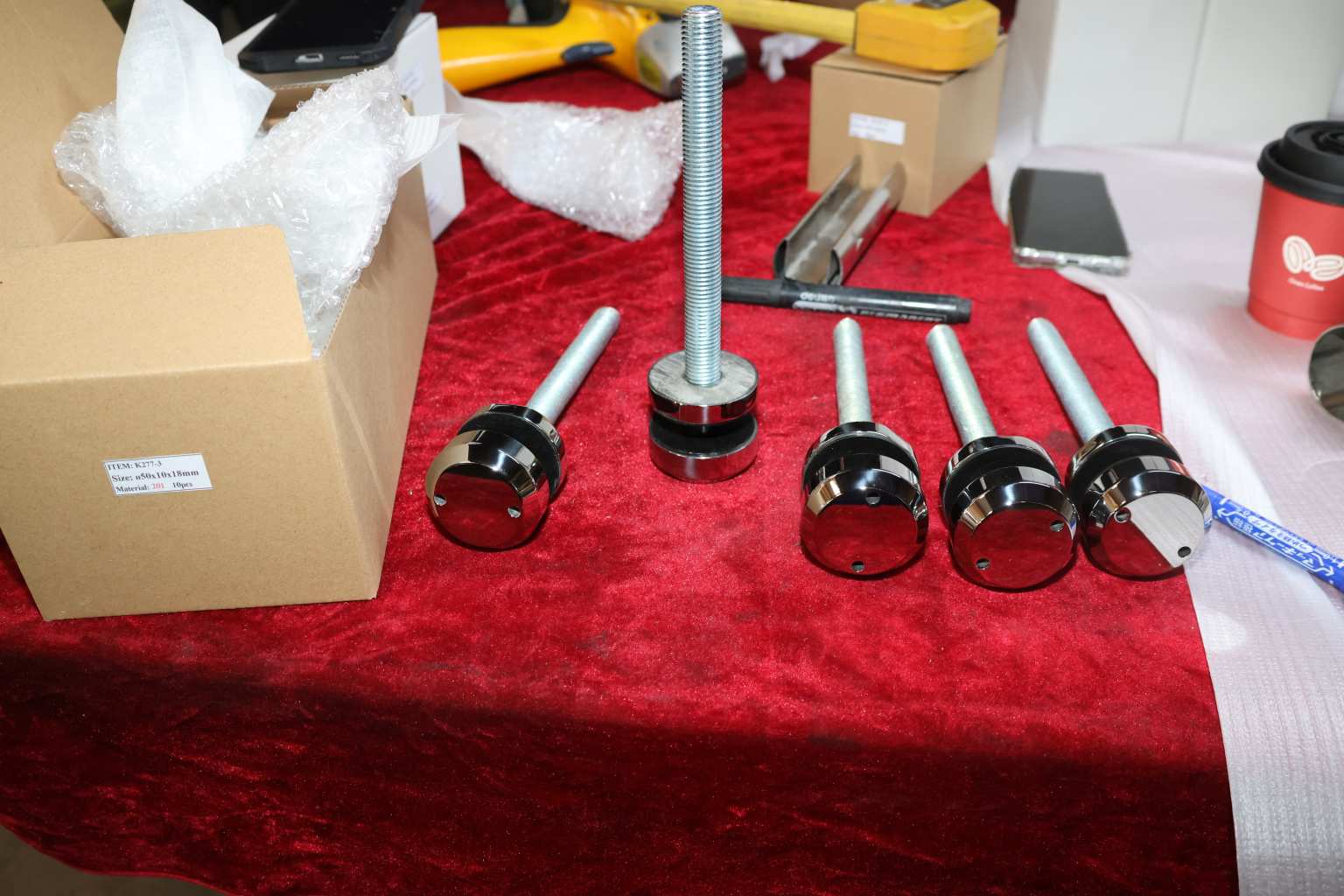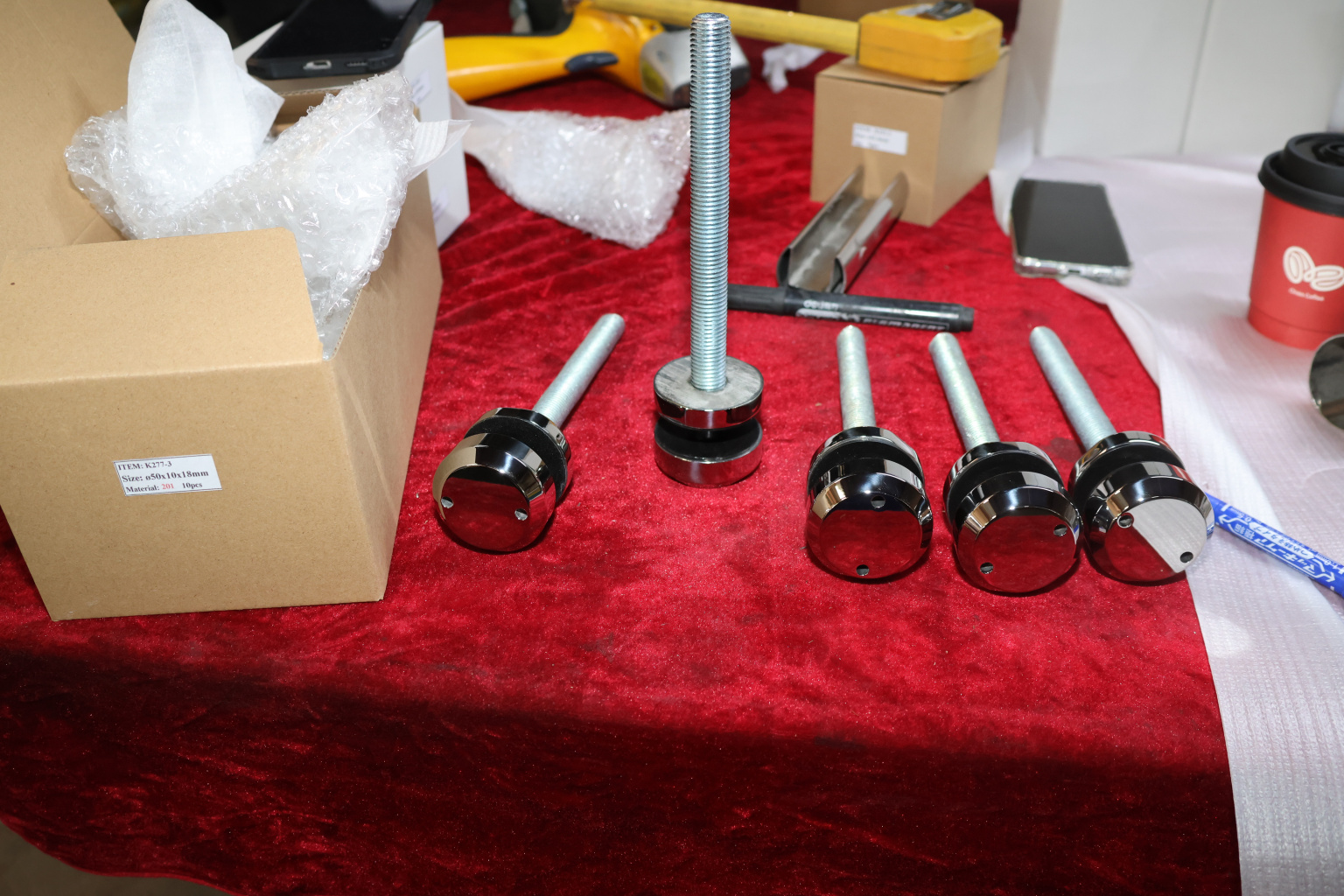 Стеклодержатель Ø50х10х18, шпилька М16х205 мм, для стекла 8-40 мм, AISI (201), с возможностью регулировки выноса до 65 мм, для торцевого крепления стекла, полированный, литой k277-3
