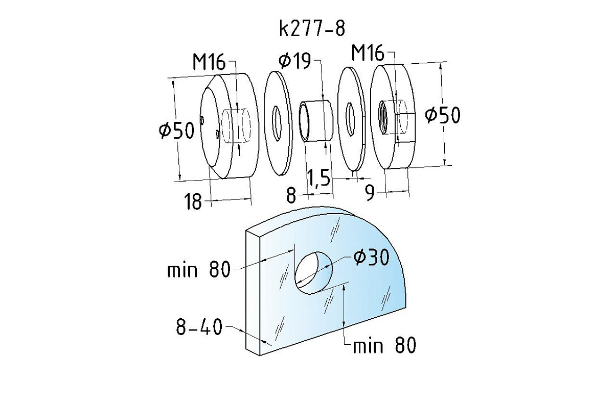 Точечный стеклодержатель для торцевого крепления несущего стекла в широчайшем диапазоне от 8 (4+4) мм до 40 (20+20) мм. Диаметр наружной (хрюшка) и внутренней шайб по 50 мм. Для затягивания гайки рекомендуем использовать ключ к. k367-2