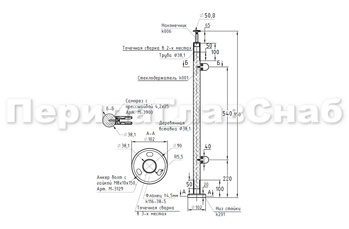 Готовые стойки – это экономия Вашего времени и денег. Приобретая готовую стойку Вы можете собрать ограждение сами, не привлекая монтажную бригаду и экономя денежные средства на монтаже. Стойка легко монтируется к полу благодаря треханкернуму фланцу с отверстиями под анкер-болт М8 ( М-3129М-3843М-3838) или шпильку ( М-3959М-3969)  комплекте с хим анкером Ф-0799 или Ф-0800, а крепеж скрывает декоративная крышка идущая в комплекте стойки. Поручень из нержавеющей стали  можно закрепить при помощи самореза ( М-3850М-3847М-3215), либо при помощи заклепки ( М-3214) и винта М6 ( М-3973) что на порядок эффективней, для крепления при помощи заклепок необходимо растачивать отверстие в ложементе. Если вы используете пластиковый ( k893k897k892k891k894k895k899) или деревянный поручень, то его можно закрепить при помощи саморезов ( М-3217, М-3850М-3215). После покраски дубовой проставки подклеиваете клеем ( Ф-1127, Ф-1105). Стекло заказывается после установки стоек и снятия размеров. После того, как стекло готово к установке, при помощи шестигранника ( k931k932) разъединяете стеклодержатель, надеваете стекло и закручиваете обратно. Ограждение готово!