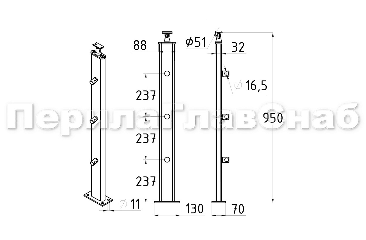 Стойка квадратная 40х40: 4 литых стеклодержателя, шлифованная, высота 950 мм AISI 304 k746-7 купить в Челябинске