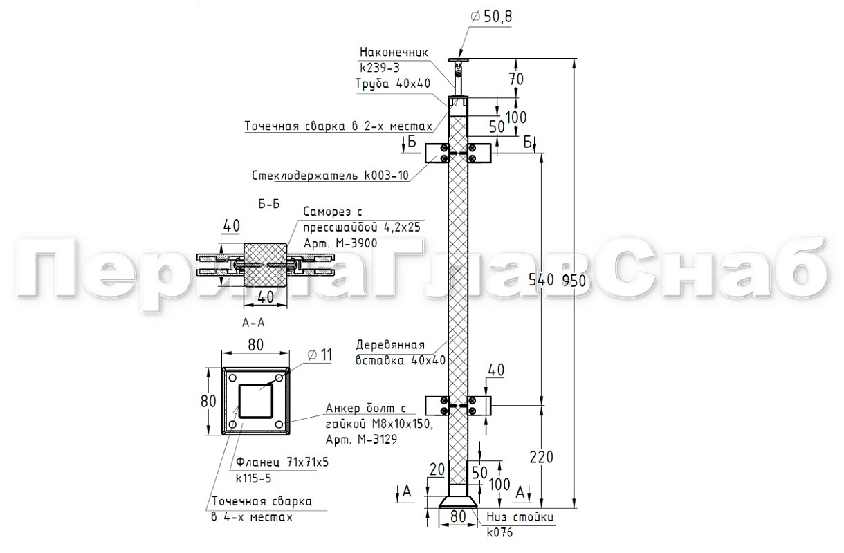 Стойка квадратная 40х40: 4 литых стеклодержателя, шлифованная, высота 950 мм AISI 304 k746-7 купить в Челябинске