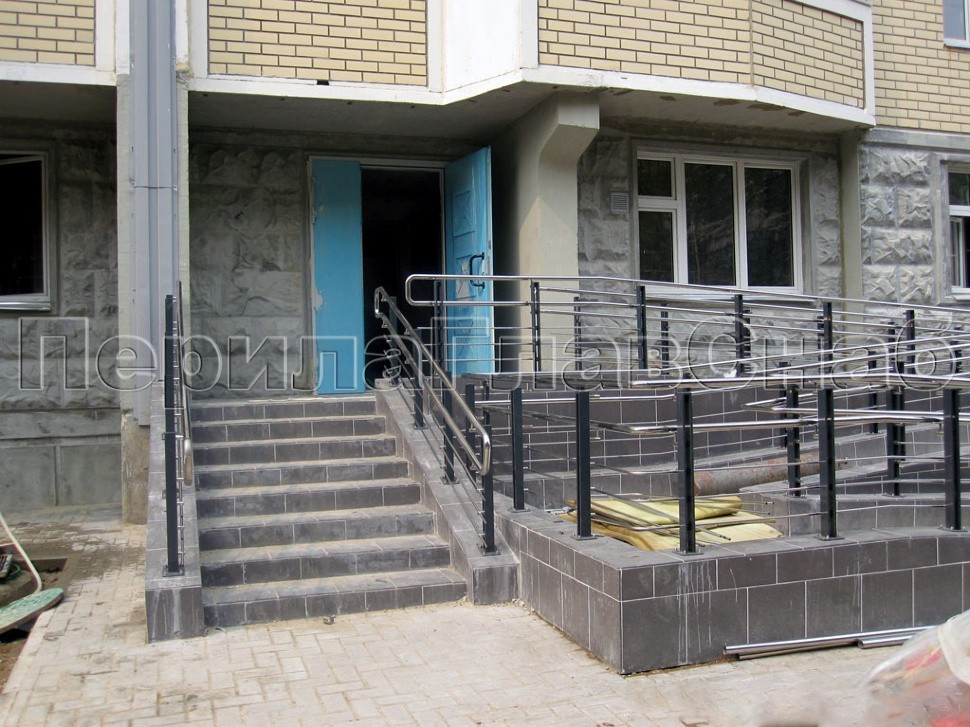 Благодаря такому неординарному дизайнерскому решению, удалось создать визуальный акцент на нержавеющем полированном поручне ограждений, а также отдельно и тонко подчеркнуть расположенные параллельно нему ригели или как их ещё называют «тетивы» или «струны» из трубок меньшего, чем поручень диаметра, заполняющих пространство между поручнем и уровнем пола или земли.