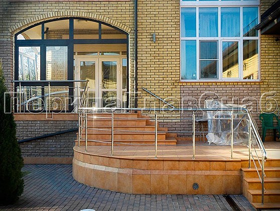 Со стороны двора ригельное ограждение входной группы с загнутым по радиусу поручнем из нержавеющей стали гармонично повторяет изгиб террасы.