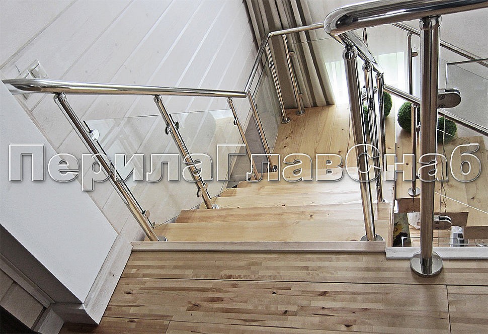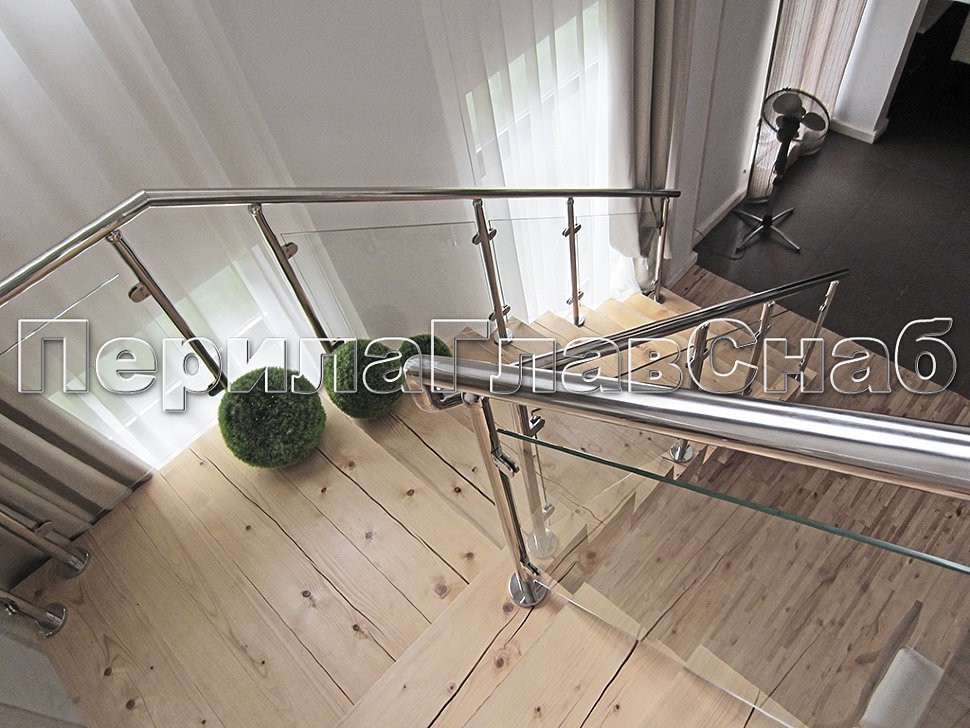 Ограждение с пластинчатыми стеклодержателями. Стекло крепится к круглым стойкам из нерзжавеющей стали.