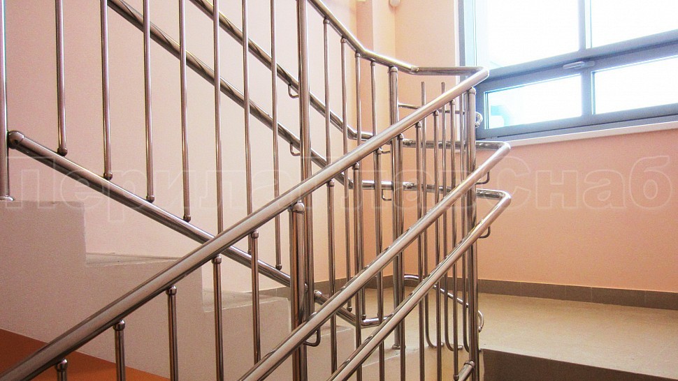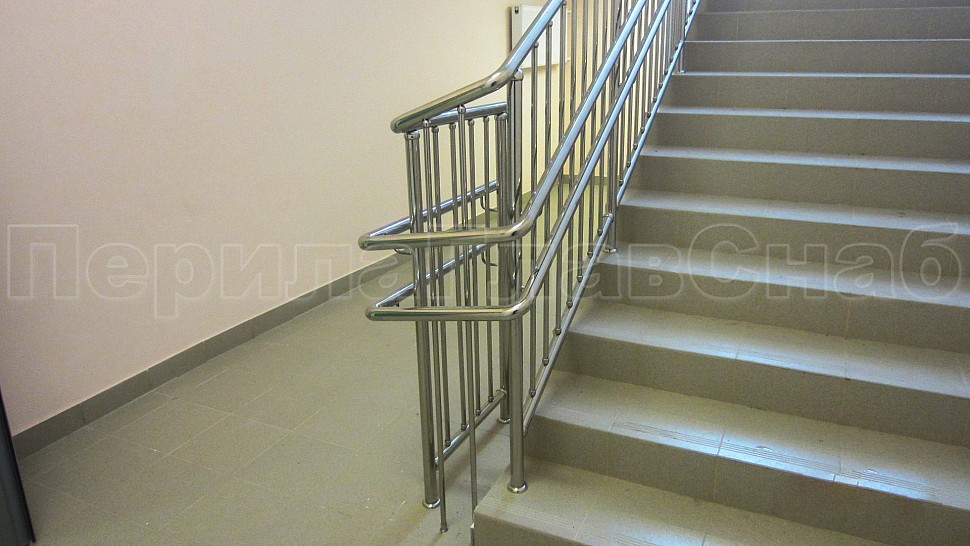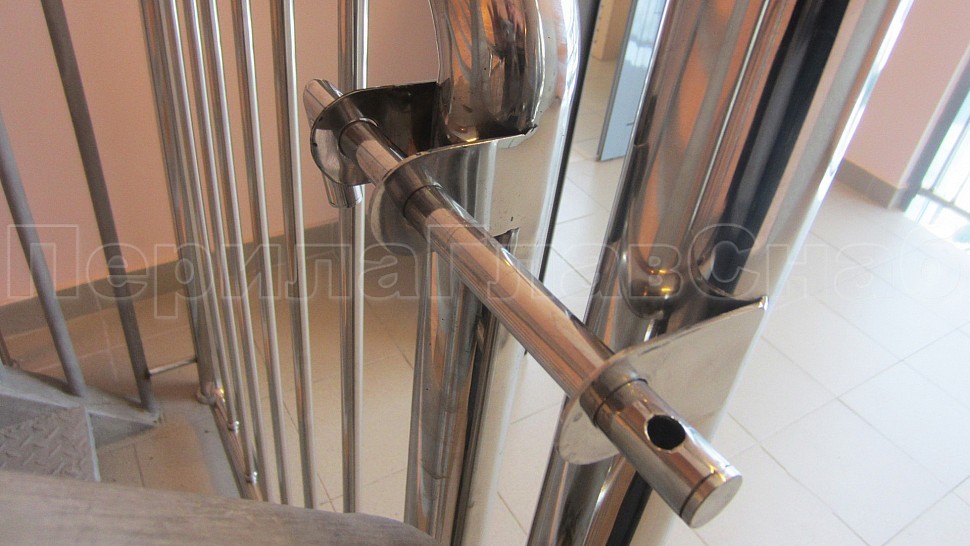 • У лестницы же стойки имеют высоту чуть большую — 950 мм, труба Ø38 мм. Устанавливаются на расстояние через две ступени в третью, на прямых участках не более 1000 мм друг от друга. Наконечник выполнен в декоративном стиле в виде сферы. Для большей безопасности установлены семь ригелей между стойками, и, в отличие от пандуса, они крепятся к стойке сваркой снизу и установлены вертикально. Поручень двойной диаметром 38 мм установлен на высоте 700 мм и 900 мм, крепится к стойке на выносных держателях и на поворотах завязан бубликом.