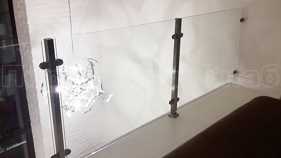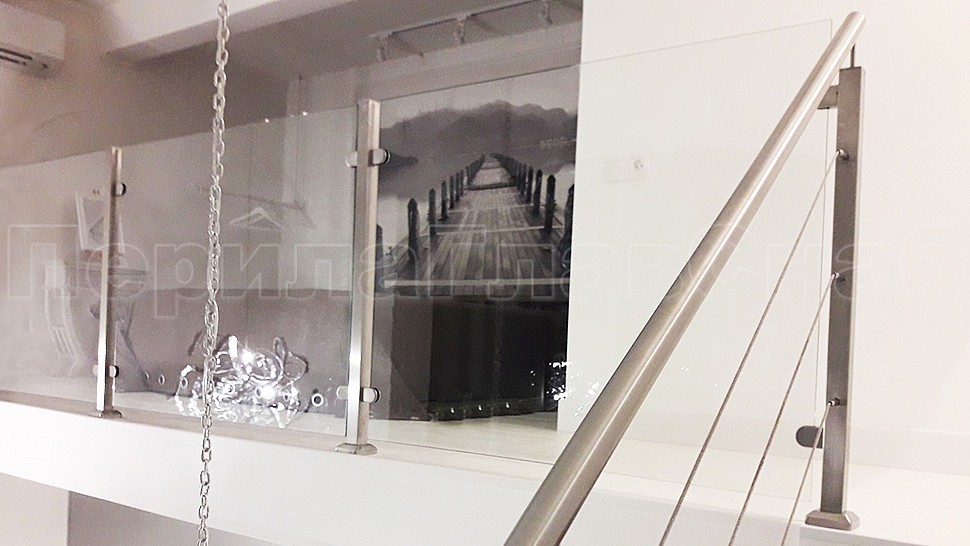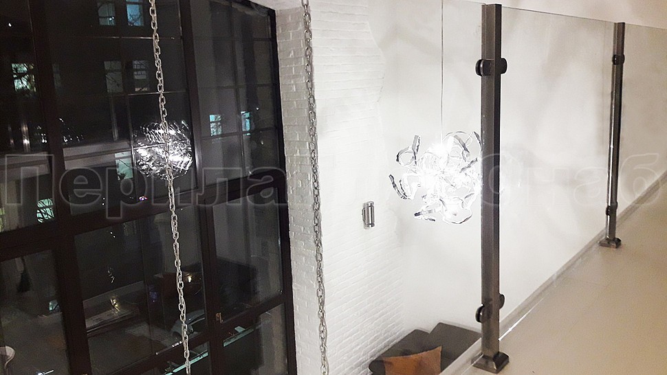 Ограждение второго этажа: стойки 40х40 мм с закаленным прозрачным стеклом 8 мм на зажимных стеклодержателях . Крепление нержавеющих элементов ограждения между собой точечная аргонно-дуговая сварка, длина швов 2 мм, с последующей зачисткой и полировкой.
