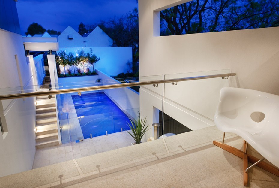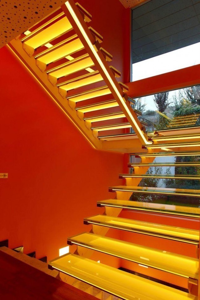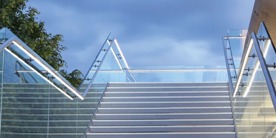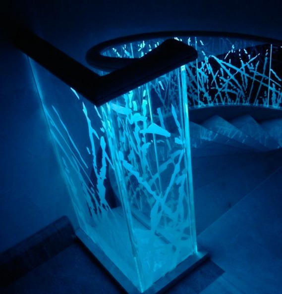 Хорошее практическое применение дает подсветка в дополнительном выносном поручне. В таком виде подсветки хорошо освещаются как поручень и стекло, так и ступени или внутреннее пространство, огражденное стеклом. Очень часто различные виды размещения комбинируют, например, используют подсветку в профиле и подсветку в дополнительном поручне.