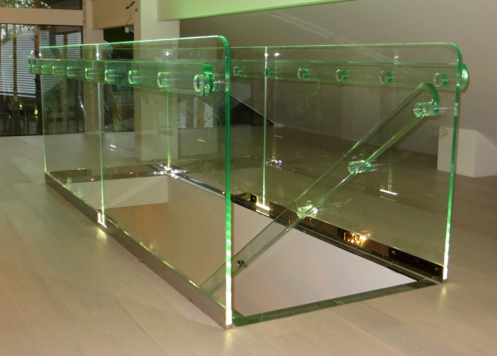 В базовой конфигурации используется обычное прозрачное каленое стекло. Очень красиво смотрится ультра-прозрачное подсвеченное стекло сверху и снизу (дорогой премиум вариант).