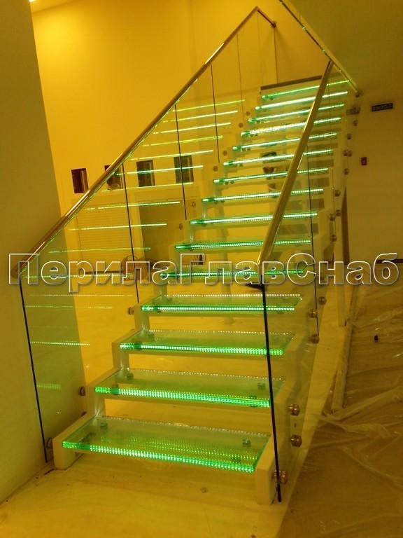 При креплении стекла на торцевое, точечное крепление (более недорогой вариант) подсветку можно установить только в поручень или выносной поручень.
