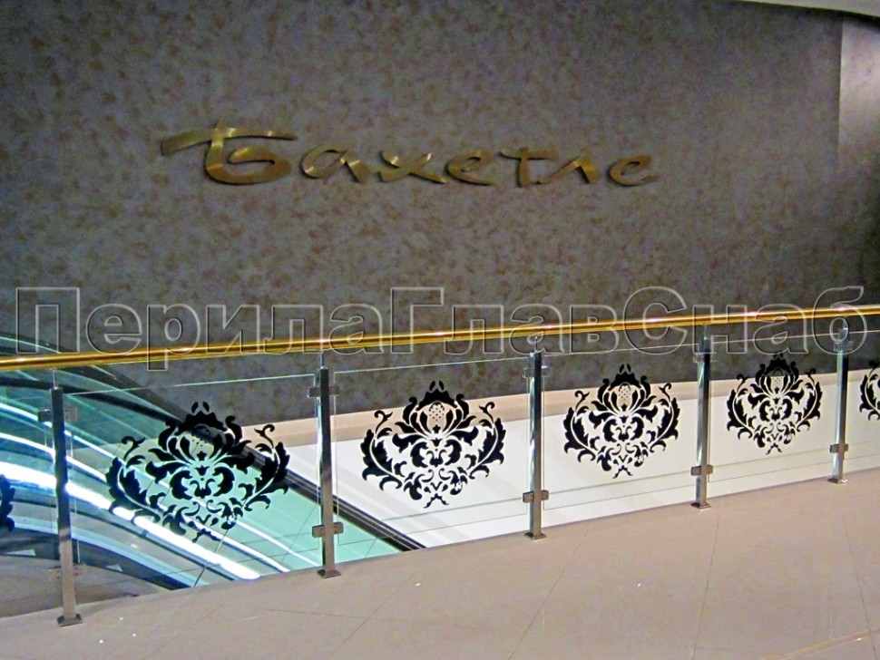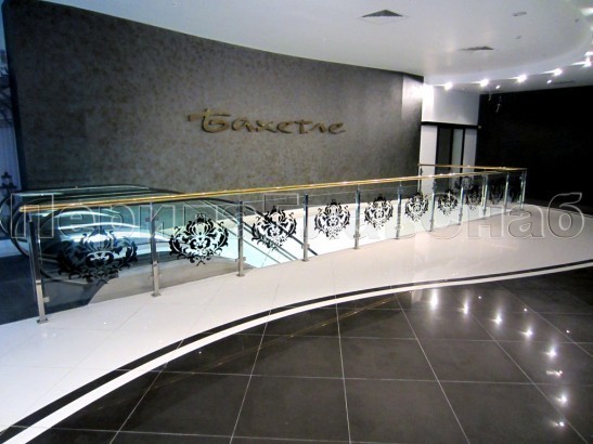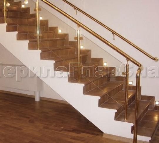 - Ограждение лестницы с прозрачным стеклом, стойками и поручнем из латуни